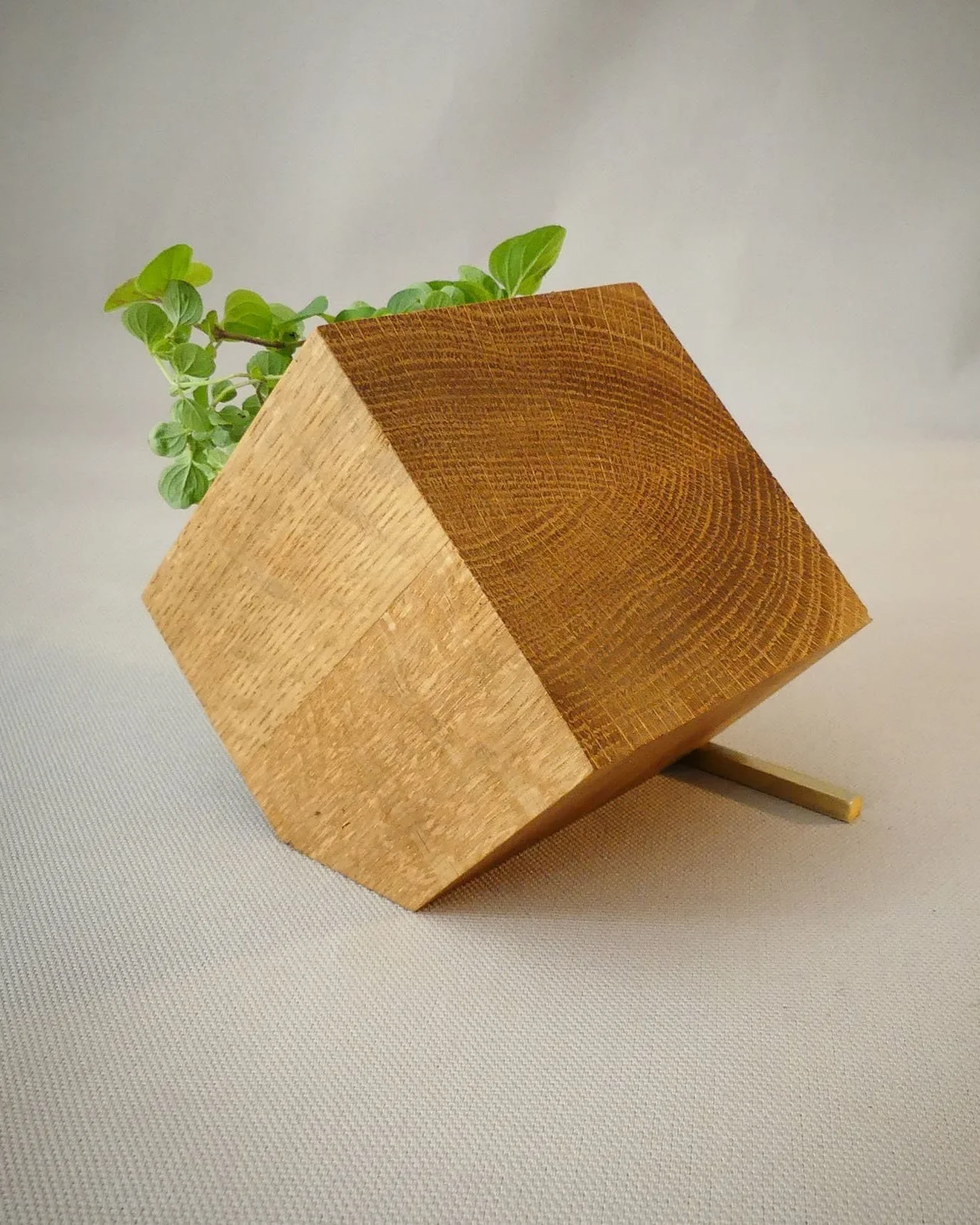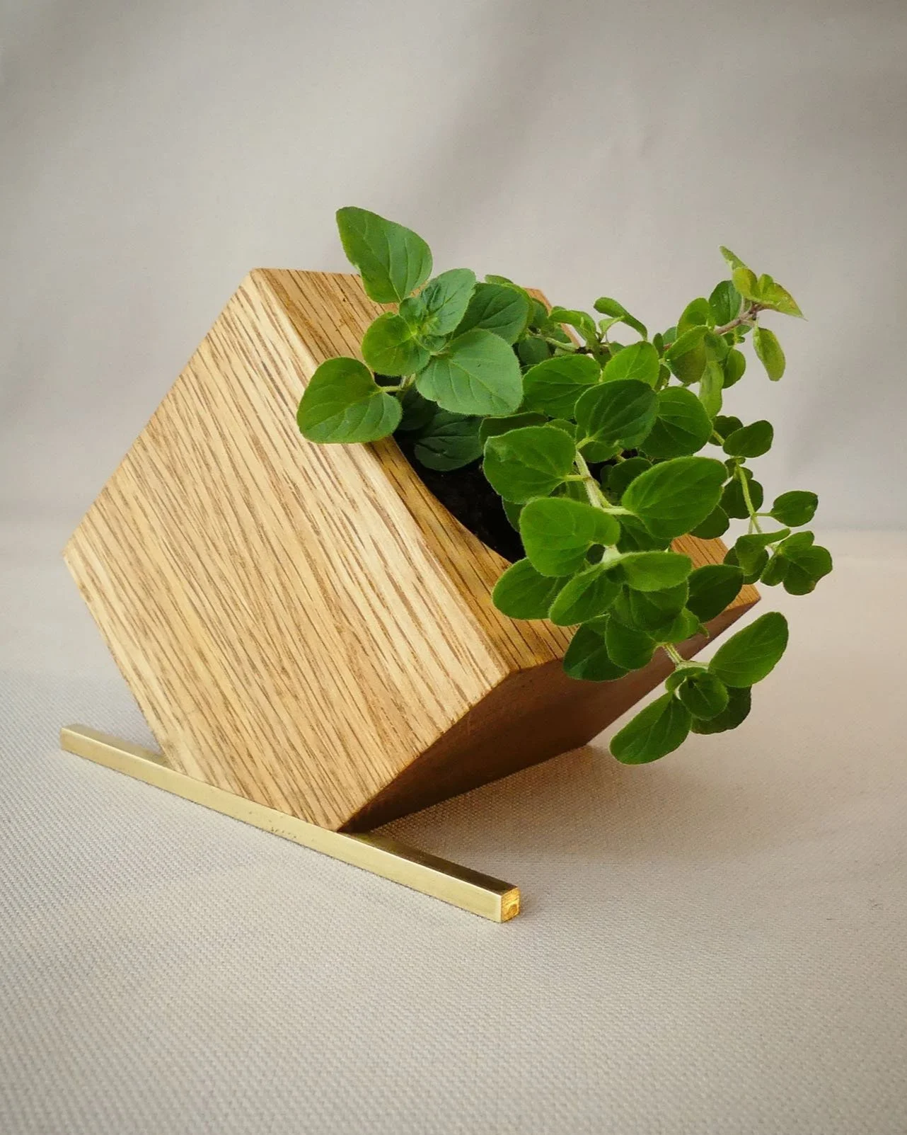 small planter: solid white oak with brass detail, 4.5L x 3.25W x 3.875H, $60