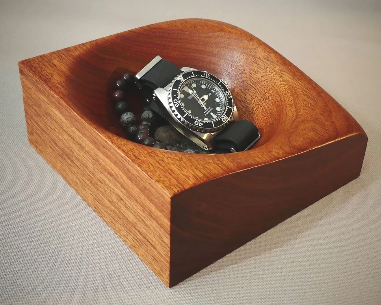 catch-all: hand-carved solid mahogany, 6L x 6W x 2.25H, $150